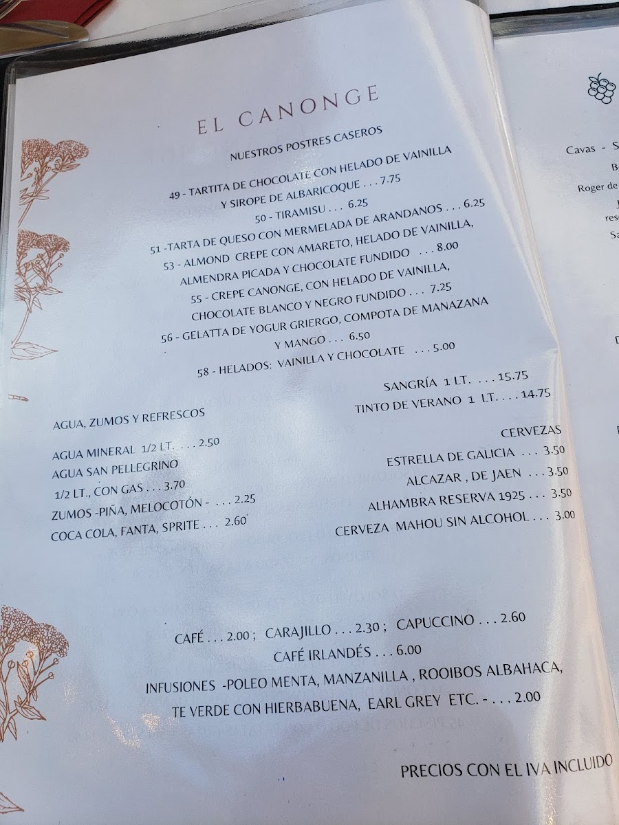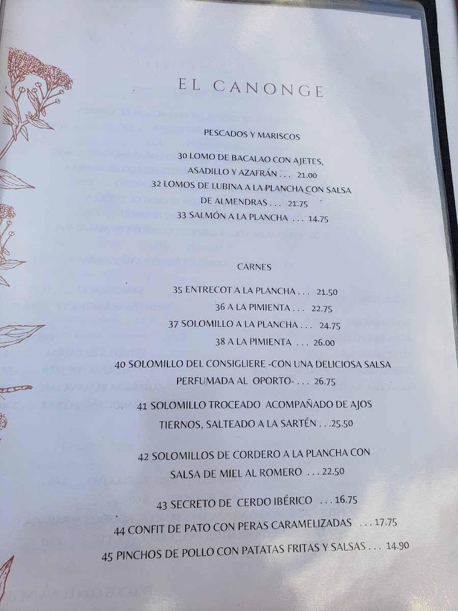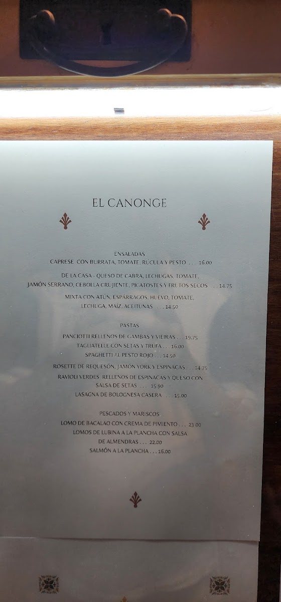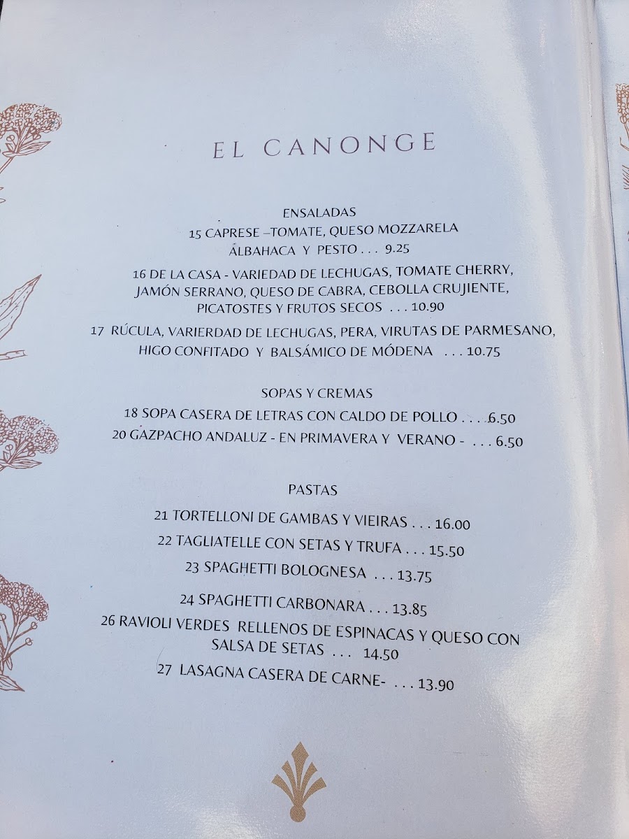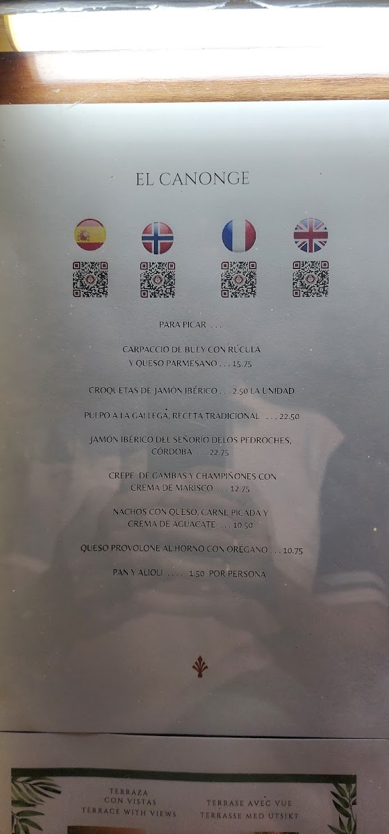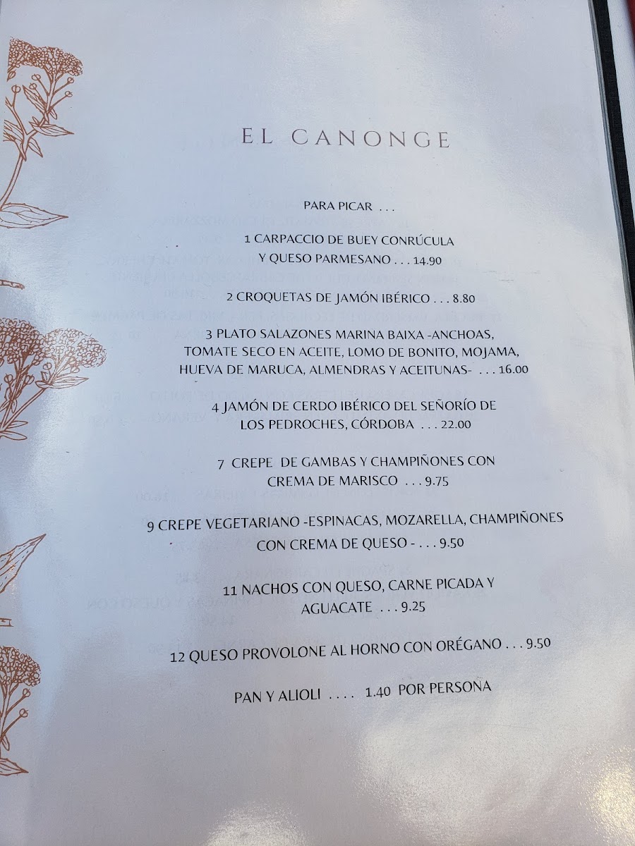 The menu at El Canonge offers a delightful selection of dishes that cater to a variety of tastes, blending traditional and contemporary flavors. For starters, the Queso Provolone is a rich and creamy choice that pairs perfectly with the fresh bread served alongside it. Moving onto the main courses, the Entrecot A la Plancha is a standout with its perfectly grilled meat, tender and bursting with flavor, while the Lubina is a delicately prepared sea bass that highlights the chef's expertise in seafood. Vegetarians will appreciate the Ensalada de Pera E Higos, a refreshing salad with the sweetness of pears and figs, perfectly balanced with a savory dressing. Pasta lovers can indulge in the classic Espaguetis Carbonara, which combines creamy sauce with a savory touch of pancetta. The Crepe Vegetariano offers a lighter, yet satisfying option, filled with fresh vegetables. For seafood enthusiasts, the Raviolli de Vieira Y Gambas brings together scallops and prawns in a delicate, handmade ravioli. The Carpaccio de Ternera is a fantastic choice for those who enjoy a more refined dish, featuring thinly sliced beef with a tangy dressing. The Berenjena Rellena de Carne presents a flavorful mix of eggplant stuffed with savory meat, while the Mojama Tomates Secos Anchoas is a traditional Spanish dish combining salt-cured tuna with sun-dried tomatoes and anchovies. The Brocheta de Pescado offers a beautifully skewered selection of fish, grilled to perfection, and the Gambon Al Ajillo serves up large prawns in a garlic-infused sauce that is both aromatic and bold. For those seeking a light and delicate option, the Lenguado A la Plancha offers a perfectly grilled sole that retains its tender texture. Each dish at El Canonge is crafted with fresh ingredients, showcasing the restaurant’s commitment to quality and authentic flavors.